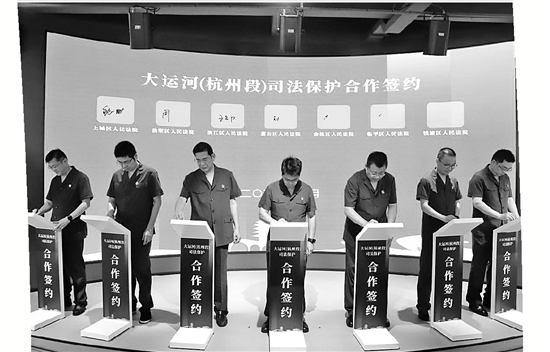 同时,杭州法院还着眼于深化区域司法协作。2022年以来,杭州法院与黄山法院不断加强联动,跨省开展生态环境法治共护系列活动,共同签署了《新安江—千岛湖流域司法协作框架协议》,努力形成保护一湖秀水的上下游合力。为保护、传承、发展大运河提供有力的司法保障和服务,今年6月13日,杭州法院在塘栖古镇设立大运河(杭州段)司法保护基地,大运河(杭州段)沿线7家法院共同签署了司法保护共识。
