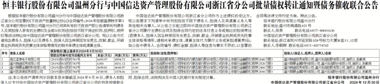 恒丰银行股份有限公司温州分行与中国信达资产管理股份有限公司浙江省分公司批量债权转让通知暨债务催收联合公告
