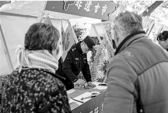 1月1日是湖州南浔一年一度鱼文化节开幕的日子。当日,南浔区公安分局和孚派出所的民辅警以摆摊宣讲、书写福字等形式,结合反诈、交通安全、禁毒等知识展开平安宣传,让游客收获更多幸福感、安全感。