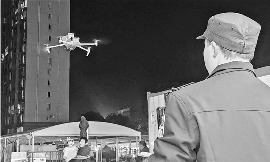 为推进“冬季行动”取得实效,三门公安海润派出所利用无人机高空夜巡的辨识度,提高空地一体指挥能力,严防各类安全事故的发生。图为1月4日晚,民警操控无人机对夜宵摊等地进行高空巡逻。