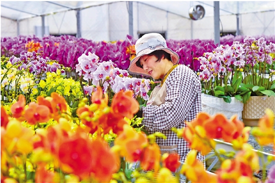图为1月5日,在江苏省如皋市如城街道保来园艺花卉基地,花农在打理蝴蝶兰。