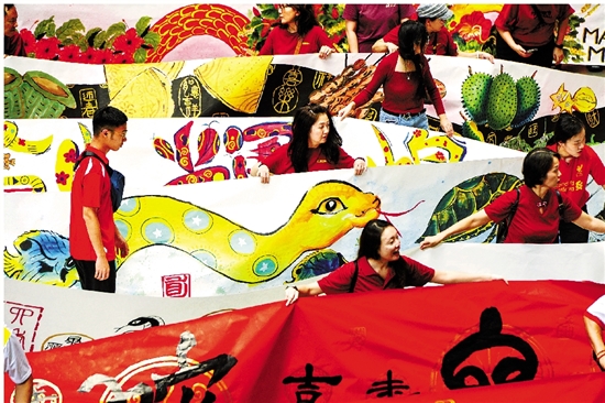 1月5日,在马来西亚吉隆坡,大约160名书画学员共同在长达2025尺长卷上创作以“乙巳蛇年”为主题的作品,表达对春节美好的祝福和向往。