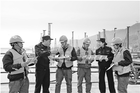 1月7日,三门县公安局健跳派出所结合“冬季行动”,组织民警深入防区,开展反诈、安全防范和普法宣传活动,助力行动走深走实。图为民警在光伏施工现场,向工人宣传安全防范知识。 通讯员 林利军