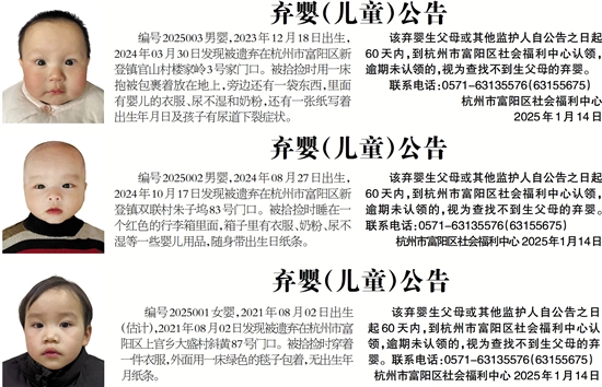 编号2025003男婴,2023年12月18日出生,2024年03月30日发现被遗弃在杭州市富阳区新登镇官山村楼家岭3号家门口。被拾捡时用一床抱被包裹着放在地上,旁边还有一袋东西,里面有婴儿的衣服、尿不湿和奶粉,还有一张纸写着出生年月日及孩子有尿道下裂症状。