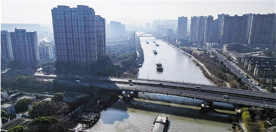 1月13日,装载各类货物的船舶在位于湖州市的长湖申线水域有序航行,一派繁忙。2024年,湖州市完成港口货物吞吐量1.48亿吨、集装箱吞吐量90.6万标箱,两项指标均排名全省内河第1,同比增长分别为8.39%、6.06%。