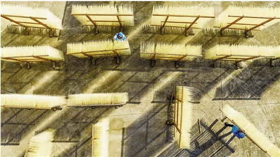图为1月13日,丰城市泉港镇西岸村村民在晒场晾晒手工挂面。