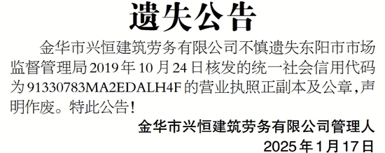 金华市兴恒建筑劳务有限公司不慎遗失东阳市市场监督管理局2019年10月24日核发的统一社会信用代码为91330783MA2EDALH4F的营业执照正副本及公章,声明作废。特此公告!
