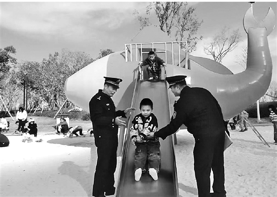 新春佳节临近,东阳市公安局江北派出所扎实开展大走访大排查大宣讲活动,确保群众安心过节。图为民警在社区公园内与休闲的居民互动。 通讯员 徐步文