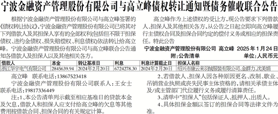 宁波金融资产管理股份有限公司与高立峰债权转让通知暨债务催收联合公告