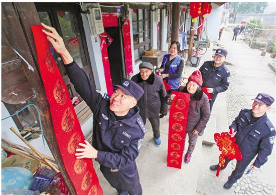 近日,台州市公安局黄岩分局结合春节期间安全稳定各项工作,下村社开展迎春大走访活动。图为黄岩公安北洋派出所民警在看望慰问老人时,给他们贴春联、挂灯笼。 通讯员 喻跃翔 摄