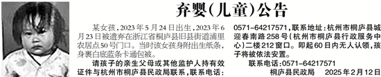 请孩子的亲生父母或其他监护人持有效证件与杭州市桐庐县民政局联系,联系电话:0571-64217571,联系地址:杭州市桐庐县城迎春南路258号(杭州市桐庐县行政服务中心)二楼212窗口。即起60日内无人认领,孩子将被依法安置。