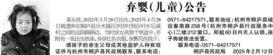 请孩子的亲生父母或其他监护人持有效证件与杭州市桐庐县民政局联系,联系电话:0571-64217571,联系地址:杭州市桐庐县城迎春南路258号(杭州市桐庐县行政服务中心)二楼212窗口。即起60日内无人认领,孩子将被依法安置。
