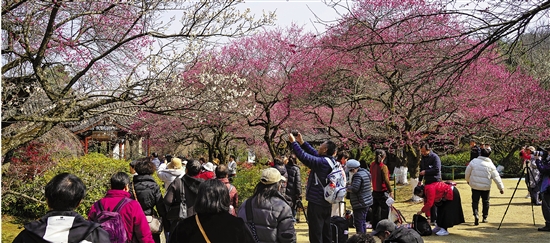 昨日杭城天气放晴,“金蛇献瑞 梅满灵峰”灵峰探梅花事活动吸引了众多游客共享“梅”好时光。