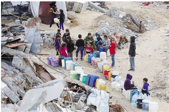 | 2月19日,在加沙地带北部拜特哈嫩,儿童排队等待取水。 联合国、世界银行和欧洲联盟18日就巴勒斯坦加沙地带重建发布评估报告,指出重建工作需要超过500亿美元。报告数据显示,延宕一年多的新一轮巴以冲突导致加沙地带超过29.2万座民宅损毁或损坏,95%的医院停止运转,当地经济收缩幅度高达83%。 |