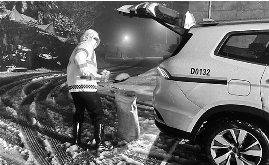中队辖区多为山区,地形复杂,为有效应对雨雪恶劣天气对交通安全的影响,中队在24小时加强路面巡逻,并及时准备专项物资,扫除道路交通隐患。