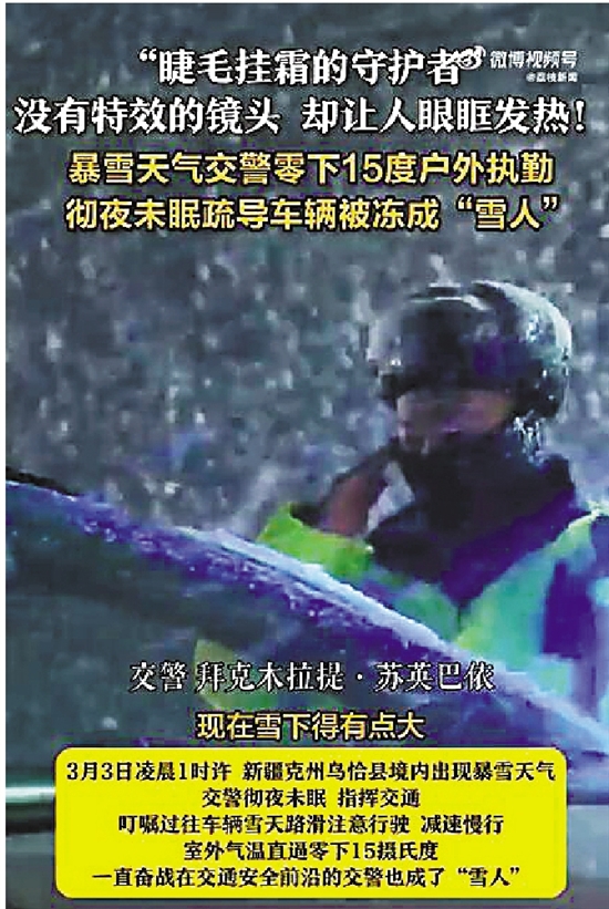 3月3日凌晨1时许,新疆克州乌恰县境内出现暴雪天气,气温直逼零下15摄氏度。为指挥交通,叮嘱过往车辆雪天路滑注意行驶、减速慢行等,交警彻夜未眠,被冻成了“雪人”,用冻红的双手、结冰的睫毛托起平安。交警拜克木拉提·苏英巴依称,虽然辛苦,但只要过往车辆能安全到家,累点也挺开心的。