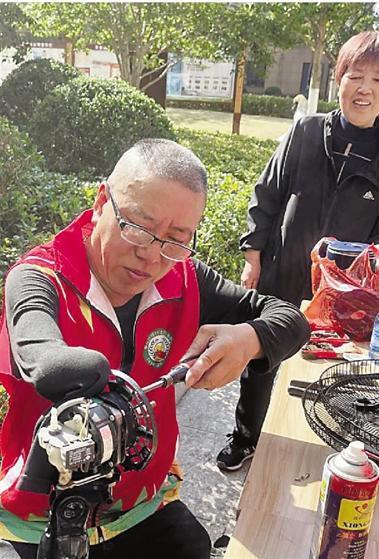 本报讯 近日,在宁波市奉化区岳林街道金明社区,一位中年男人正低头修理着居民送来的微波炉,只见他左手灵活地拧动螺丝,一番捣鼓后,微波炉又能运转了。围观人群发出阵阵赞叹,原来,这位技艺精湛的维修师傅竟是一位失去右手的残疾人。