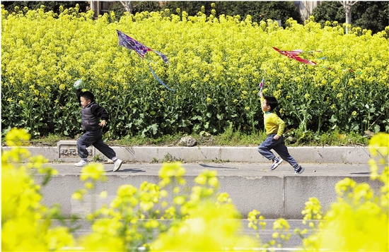 春暖花开,神州大地春意盎然。人们来到户外踏青赏景,尽享美好。图为3月20日,孩子们在浙江省湖州市德清县乾元镇放风筝。
