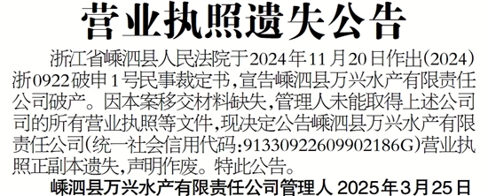 浙江省嵊泗县人民法院于2024年11月20日作出(2024)浙0922破申1号民事裁定书,宣告嵊泗县万兴水产有限责任公司破产。因本案移交材料缺失,管理人未能取得上述公司司的所有营业执照等文件,现决定公告嵊泗县万兴水产有限责任公司(统一社会信用代码:91330922609902186G)营业执照正副本遗失,声明作废。特此公告。