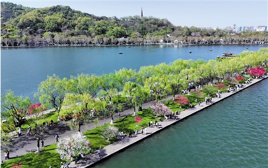 3月25日,杭城气温继续攀升。西湖白堤,桃红柳绿,春色盎然,“一桃一柳”美景让游客流连忘返。