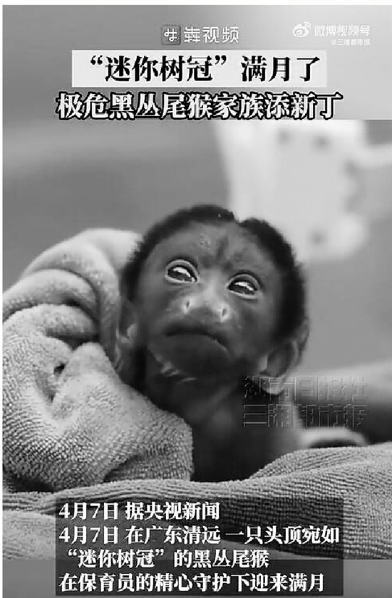 4月7日,在广东清远,一只头顶宛如“迷你树冠”的黑丛尾猴在保育员的精心守护下迎来满月。这只黑丛尾猴最显著的特征是头部至肩部披覆着浓密的深褐色或黑色毛发,就像长了个树冠似的。