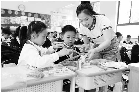 4月24日,安吉县外国语学校劳动课期间,中小学生们在老师和校外辅导员的指导下,学习体验编三股辫、酿品甜酒、以竹代塑·纸膜竹编等手工劳动,培养动手创造的能力。 潘学康 摄