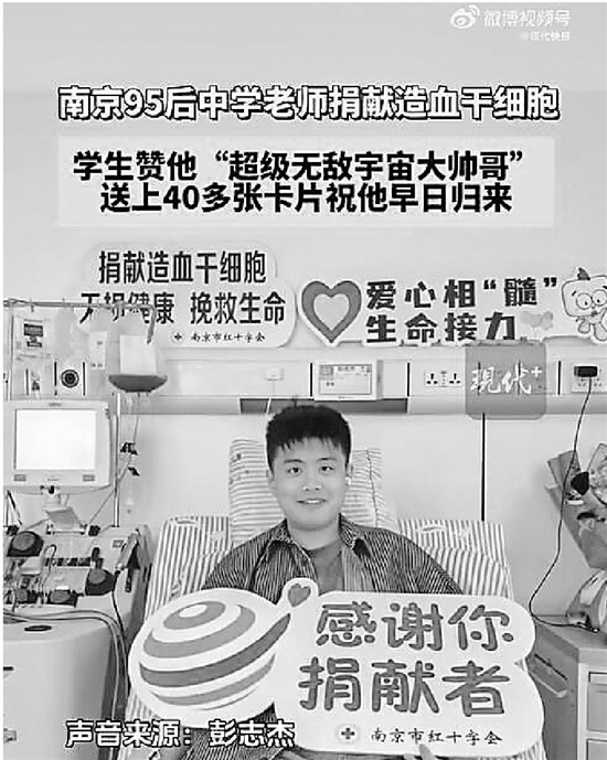 近日,江苏南京第三中学的95后生物老师兼班主任彭志杰,在东南大学附属中大医院完成造血干细胞捐献,用实际行动诠释了真正的“生命教育”。平时在学生眼里就超帅的彭志杰,因为此次善举更是被学生们称为“超级无敌宇宙大帅哥”“我心目中的英雄”。