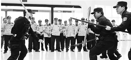 演练以“理论筑基+实战强能”为核心。医院保卫、后勤等人员先进行了安全生产专题培训。在实操环节,演练紧贴医疗场所实际,重点训练火灾扑救、消防设备的使用、消控室安全培训等。参练人员通过实际操作,进一步强化火场应变能力。在防爆特训中,巡特警大队队员示范了防暴叉、盾牌协同战术与人员疏散要点,指导安保人员灵活运用器械应对突发状况。