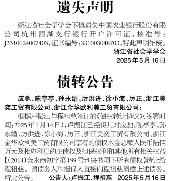 根据卢振江与程祖慈签订的《债权转让协议》(签署时间:2025年1月14日),卢振江已经将其对应驰、陈亭亭、孙永缙、厉洪进、徐小海、厉正、浙江美奕工贸有限公司、浙江金华欧利美工贸有限公司享有的债权本金总额人民币陆佰万元及相应利息的主债权及担保权利和其他所有相关权益【(2014)金永商初字第199号判决书项下所有债权】转让给程祖慈。请债务人和担保人直接向程祖慈清偿上述债务。特此公告。 公告人:卢振江、程祖慈 2025年5月16日