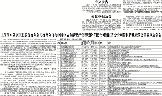上海浦东发展银行股份有限公司杭州分行与中国中信金融资产管理股份有限公司浙江省分公司债权转让暨债务催收联合公告
