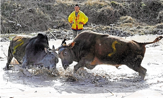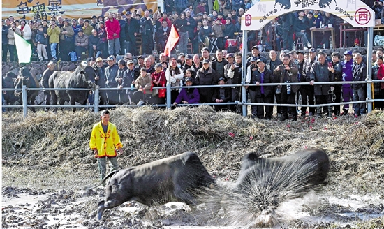 11月25日,武义县在白姆乡白鹤殿举行一年一度的民间传统斗牛庆丰收活动。来自各地的54头黄牯牛捉对厮杀,在水田里蹬腿顶角。现场泥浆四溅、喊声雷动,以此烘托热闹气氛、庆祝农业丰收。白姆乡白鹤殿斗牛已有1000多年历史,2007年,金华斗牛被列入浙江省第二批非物质文化遗产名录。 通讯员 张建成 徐智燊 摄
