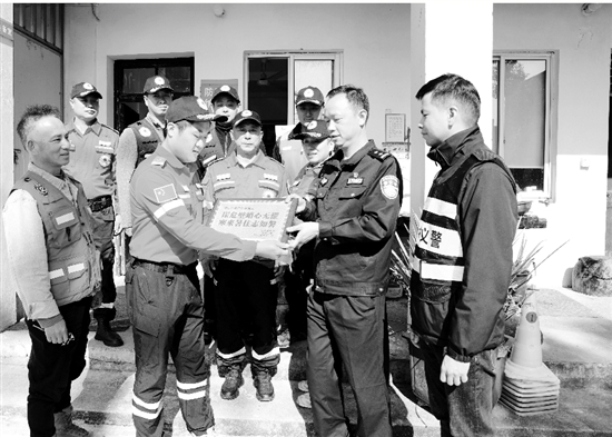 近日,临海公安杜桥派出所民辅警和义警一起,来到当地实力最强的民间公益救援队——民防救援队学习取经,并送上“崖危壁峭心无懼,寒来暑往志如磐”的牌匾。