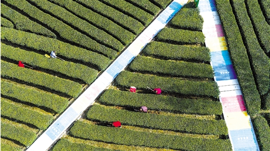 12月16日,湖北省秭归县茅坪镇花果园村村民对茶园进行翻耕深施有机肥(无人机照片)。