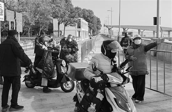 | 志愿者陈文娟在渡口引导过江乘客 |