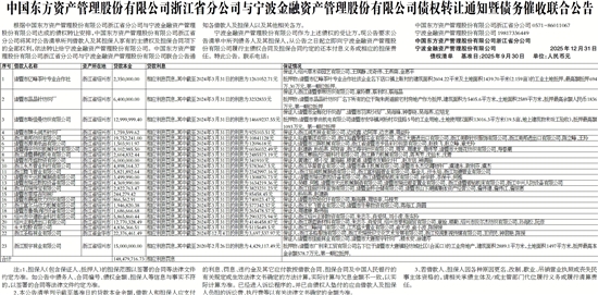 根据中国东方资产管理股份有限公司浙江省分公司与宁波金融资产管理股份有限公司达成的债权转让安排,中国东方资产管理股份有限公司浙江省分公司将其对公告清单所列借款人及其担保人享有的主债权及担保合同项下的全部权利,依法转让给宁波金融资产管理股份有限公司。中国东方资产管理股份有限公司浙江省分公司与宁波金融资产管理股份有限公司联合公告通知各借款人及担保人以及其他相关各方。