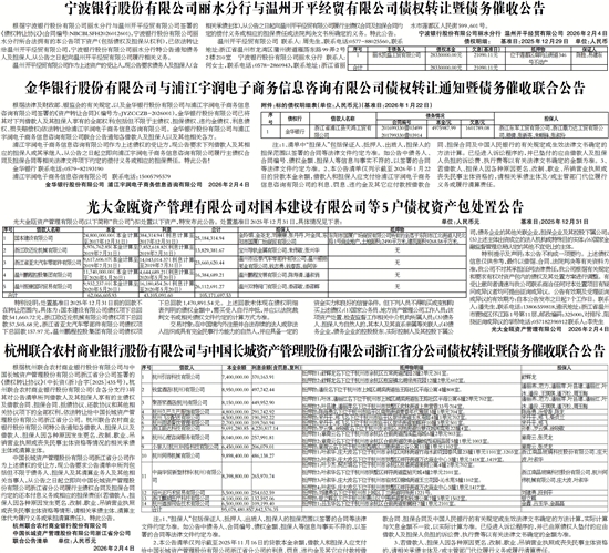 根据法律及财政部、银监会的有关规定,以及金华银行股份有限公司与浦江宇润电子商务信息咨询有限公司签署的《资产转让合同》(编号为:JYZCCZB-2026001),金华银行股份有限公司已将其对下列借款人及其担保人享有的全部权利(包括但不限于主债权、担保债权、违约金债权、利息债权、损失赔偿权)依法转让给浦江宇润电子商务信息咨询有限公司。金华银行股份有限公司与浦江宇润电子商务信息咨询有限公司联合公告通知各借款人及担保人以及其他相关各方。