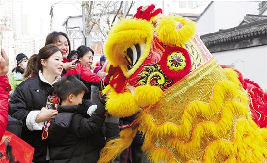 2月12日,游客在春联大会上与舞狮互动。