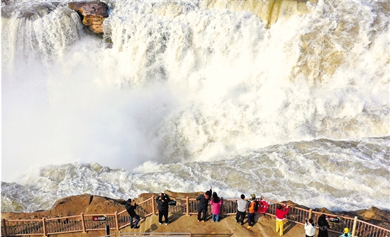 3月5日,游客在黄河壶口瀑布景区游览(无人机照片)。