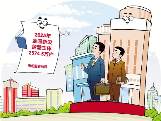 记者近日从市场监管总局获悉,2025年全国新设经营主体2574.5万户。其中,新设企业950万户,新设个体工商户1619.4万户。经营主体呈现向新向优发展态势,为高质量发展蓄势聚能。