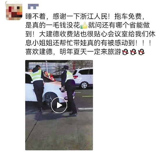 这一暖心经历,让赵女士发出感慨:“浙江的服务真的太好了!”并发了朋友圈赞道:“睡不着,感谢一下浙江人民!拖车免费,是真的一毛钱没花,就问还有哪个省能做到?大建德收费站也很贴心,会议室给我们休息,小姐姐还帮忙带娃,真的有被感动到!喜欢建德,明年夏天一定来旅游。”