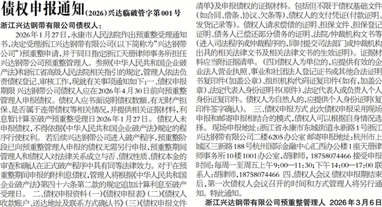 2026年1月27日,永康市人民法院作出预重整受理通知书,决定受理浙江兴达钢带有限公司(以下简称为”兴达钢带公司”)预重整申请,并于同日指定浙江天册律师事务所担任兴达钢带公司预重整管理人。参照《中华人民共和国企业破产法》和浙江省高级人民法院相关指引的规定,管理人依法负责债权登记、审核工作,现就有关事项通知如下:一、债权申报期限 兴达钢带公司债权人应在2026年4月30日前向预重整管理人申报债权。债权人应书面说明债权数额、有无财产担保、是否属于连带债权等相关情况,并提供相关证据材料,利息暂计算至破产预重整受理日2026年1月27日。 债权人未申报债权,不得依据《中华人民共和国企业破产法》规定的程序行使权利。 若后续兴达钢带公司进入破产程序,预重整阶段已向预重整管理人申报的债权无需另行申报,预重整期间管理人和债权人对法律关系成立与否、债权性质、债权本金的审查和确认在正式破产程序中具有同等法律效力。对于在预重整期间申报的附利息债权,管理人将根据《中华人民共和国企业破产法》第四十六条第二款的规定追加计算利息至破产受理日。 二、债权申报资料 (一)《债权申报表》 (二)《债权人收款账户、送达地址及联系方式确认书》 (三)《债权申报文件清单》及申报债权的证据材料。包括但不限于债权基础文件(如合同、借条、协议、欠条等)、债权人的支付凭证(付款证明、发货记录等)。债权人请求偿债的证明、担保文件、担保登记证明、债务人已偿还部分债务的证明、法院/仲裁机构文书等(进入司法程序或仲裁程序的,同时提交司法部门或仲裁机构出具的相关法律文书及相关法律文书的生效证明)。证据材料应当附证据清单。 (四)债权人为单位的,应提供有效的企业法人营业执照、事业和社团法人登记证书或其他合法证明书复印件(加盖公章)、组织机构代码证复印件(如有,加盖公章)、法定代表人身份证明书(原件)、法定代表人或负责人个人身份证复印件。债权人为自然人的,应提供个人身份证明(复印件签字确认)。 三、债权申报方式 此次债权申报采用现场申报和邮寄申报相结合的模式,债权人可以根据自身情况选择。 现场申报地址:浙江省永康市东城街道永新路1号浙江兴达钢带有限公司二楼6205办公室 邮寄申报地址:杭州市上城区三新路188号杭州国际金融中心汇西办公楼1座天册律师事务所10楼1001办公室,胡律师, 18758074466 接受申报时间:每周一至周五上午9:00—11:30;下午14:00—17:00 联系人:胡律师,18758074466 四、债权人会议 债权申报期结束后,第一次债权人会议召开的时间和方式管理人将另行通知。特此通知。