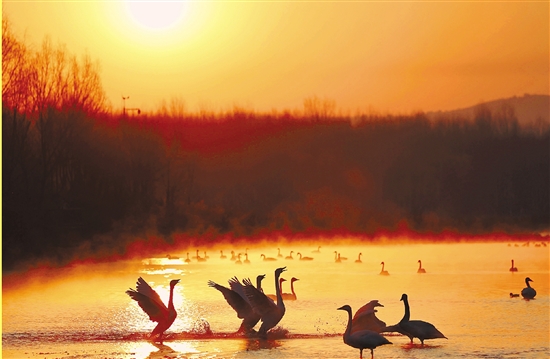 3月12日清晨,天鹅在辽宁省北票市红村天鹅湾栖息。