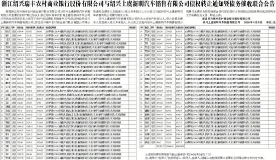 根据浙江绍兴瑞丰农村商业银行股份有限公司与绍兴上虞新明汽车销售有限公司签署的《资产转让协议》,浙江绍兴瑞丰农村商业银行股份有限公司已将所合法拥有的本公告项下资产(包括债权及担保从权利)依法转让给绍兴上虞新明汽车销售有限公司,浙江绍兴瑞丰农村商业银行股份有限公司特公告通知各债务人及担保人(或义务承担人),从公告之日起向绍兴上虞新明汽车销售有限公司履行相关义务。