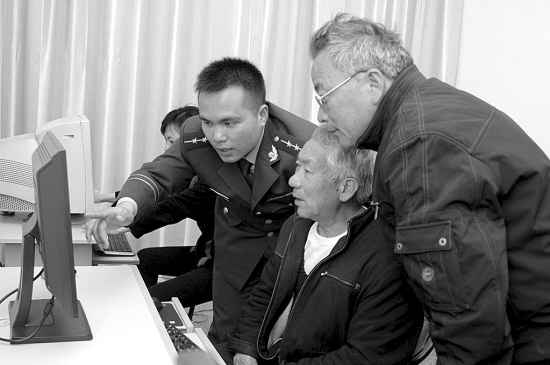 在平阳县鳌江镇海城村有个免费开放的“老年e家”,是老年人学习计算机网络知识的好去处。据悉,“老年e家”由平阳边防大队鳌江边防派出所和海城村委会共同集资筹建,驻村民警担任兼职辅导员。图为鳌江边防派出所民警在教老人如何上网。 ■吴水斌 摄