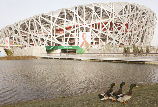 12月1日是世界艾滋病日,国家体育场“鸟巢”高悬巨大红丝带,提醒人们关爱艾滋病患者、提高预防艾滋病意识。■唐师曾 摄