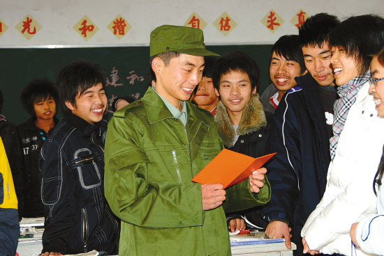 建德市工业技校07届机电(2)班的赖玉乾同学即将离开家乡与学校,光荣地踏上新的征程,奔赴福建从军。12月8日上午,他特地拿着刚领到的入伍通知书,和老师及同班同学一起分享其中的快乐,向同学们告别。