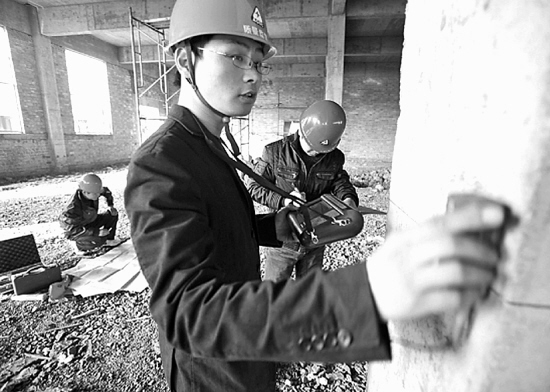 近日,安吉县环保局组织力量来到部分工业园区,对一些重点工业项目建设工地进行环境污染情况检查。图为工作人员正在一处标准厂房内检测。