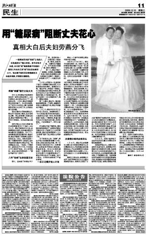 怎样才能让丈夫回心转意?就在余晓倩感到无计可施时,2004年8月,柳运华感到身体不适,余晓倩陪他去医院,医生建议柳运华做血糖与肝功能检查。当天下午,余晓倩到医院取化验结果。晚些时候,柳运华接到了余晓倩从医院打来的电话:“老公,你快来医院一趟!”在糖尿病专科门诊室里,医生指着两张化验单对柳运华说:“你血糖值这么高,已经患上了糖尿病!这病本身并不可怕,可怕的是由它引发的并发症,如心血管疾病、高血压甚至双眼失明……”柳运华被吓出一身冷汗。