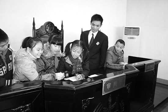 12月9日,临安市法院於潜法庭邀请了於潜镇第一小学48名学生旁听了一起人身损害赔偿案件的庭审,给学生们上了一堂生动的法制教育课。图为学生们庭审后参观法庭。■李光 摄