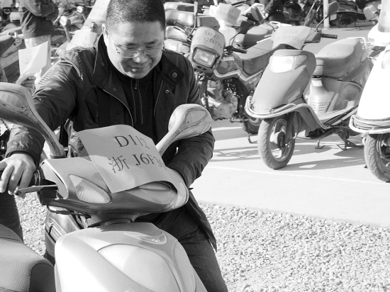 昨天上午,台州市公安局椒江分局巡特警大队的操场上热闹非凡,40辆被查获的被盗摩托车整齐划地排列着,等待着主人把它们领回家。图为一位失主推着失而复得的爱车回家。